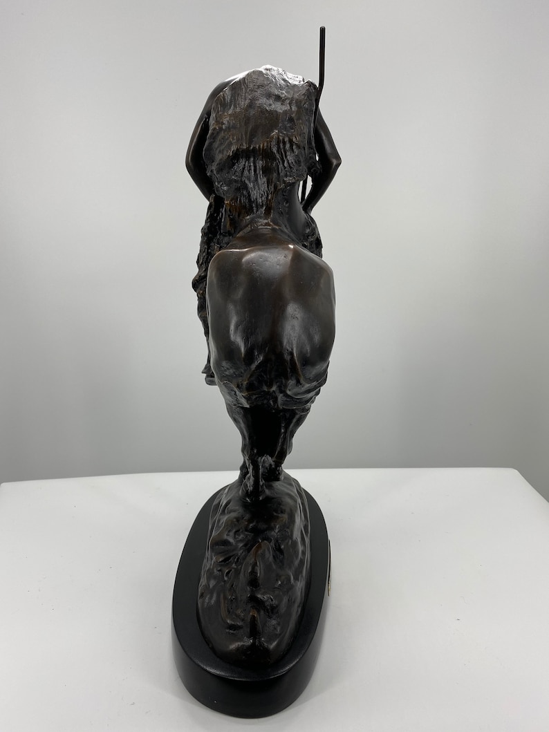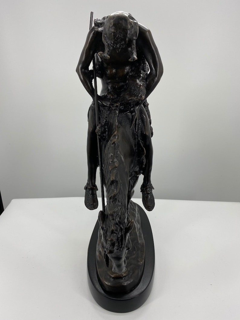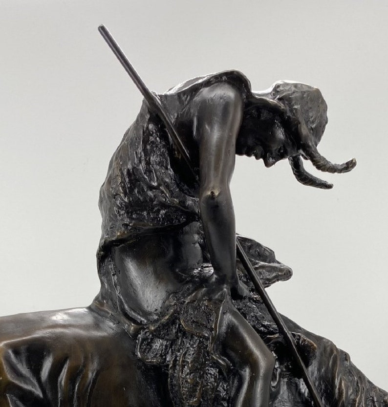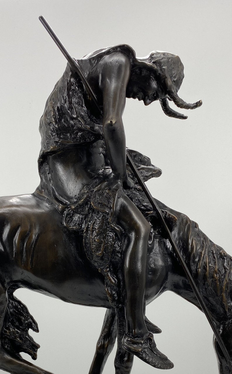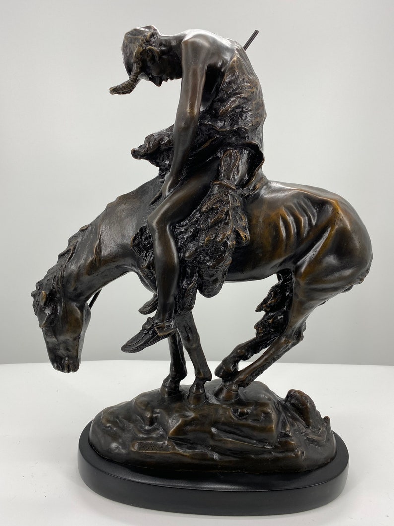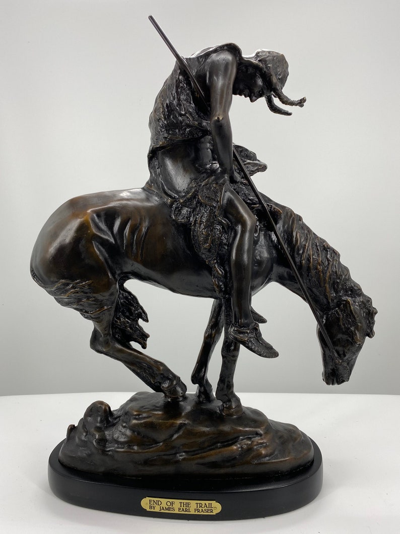 James Earle Fraser's best known sculpture “The End of the Trail” has come to symbolize the decimation of the Native American population due to the westward expansion. In 1893, the year of the World's Columbian Exposition in Chicago, the 15 year old Fraser, then a student of the Art Institute, produced the first version of this bronze sculpture. Later the Art Institute modeled and cast the sculpture. A melancholic commentary on the vanishing Indian, the work portrays an exhausted Sioux drooping on his equally weary pony. Both rider and horse literally and figuratively have reached the end of the trail. This statue is reproduced in solid bronze, cast with a patina and then hand-rubbed to bring out detail and highlights. The statue is then mounted on a fine marble base with an etched brass plate.